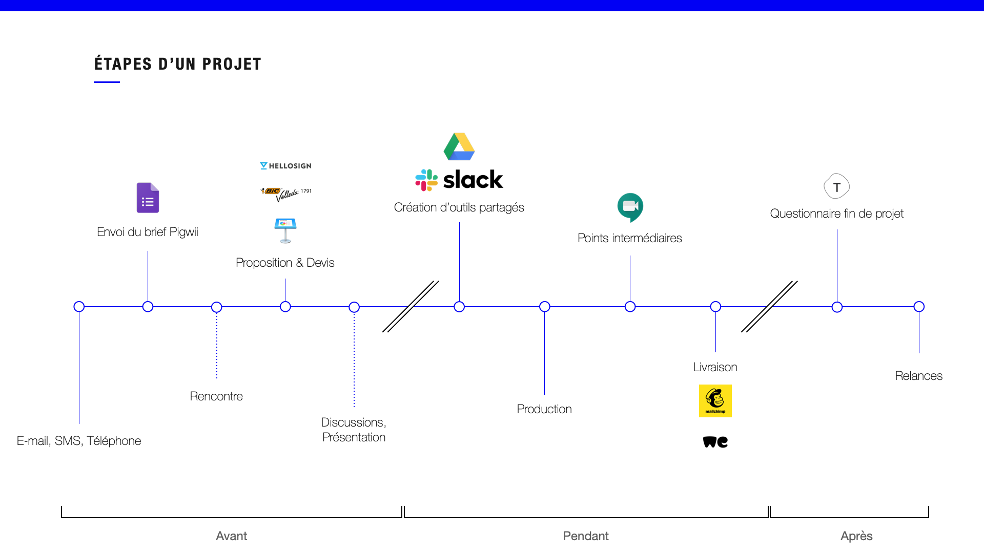 - 🎥 Pour tout ce qui est réunions intermédiaires, on les réalise soit en réel (dans notre incroyable PigwiiBox A113 ou chez le client) soit en visio. Nous avons l’habitude d’utiliser Meet mais nous nous adaptons à la solution de notre client. Oui, car on ne fait pas tout ça seuls dans notre coin mais bien en collaboration avec le client, avec plusieurs itérations.